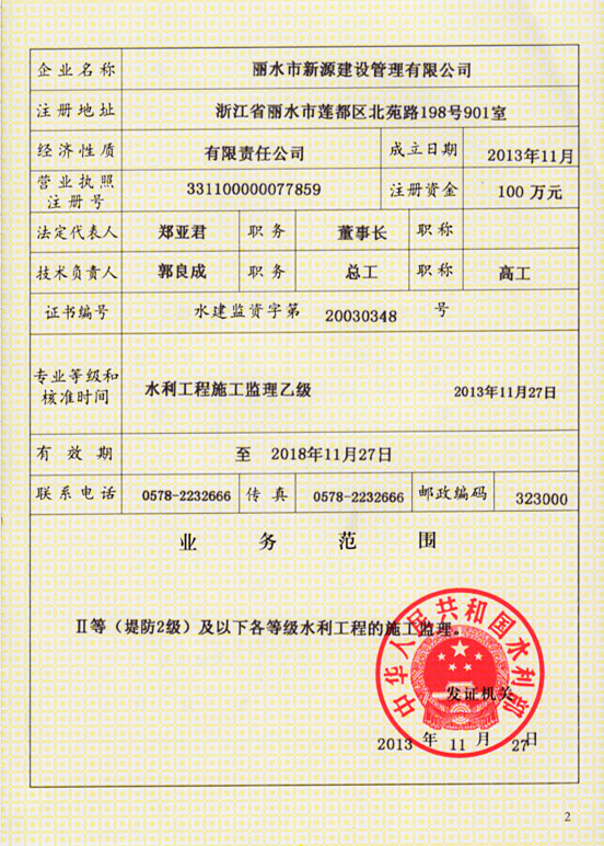 水利工程施工監(jiān)理資質(zhì)證書